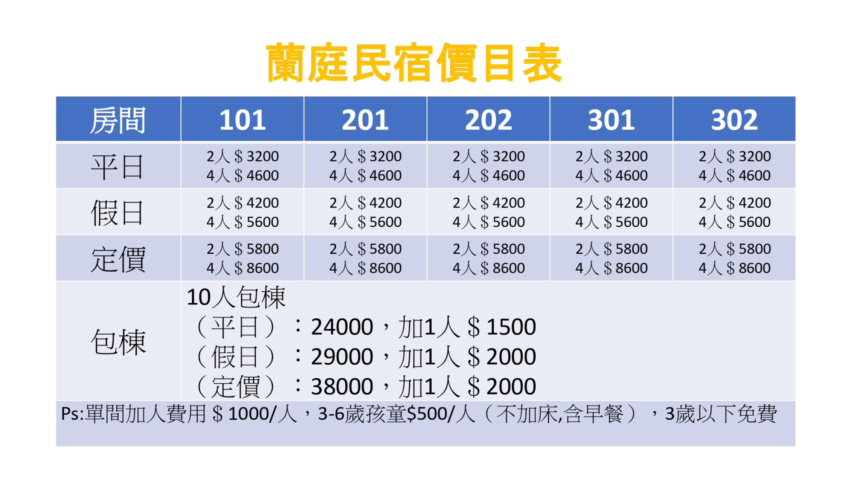 加購庭園獨棟VIP套房:平日$6,000 假日$8000 跨年.農曆春節$10,000